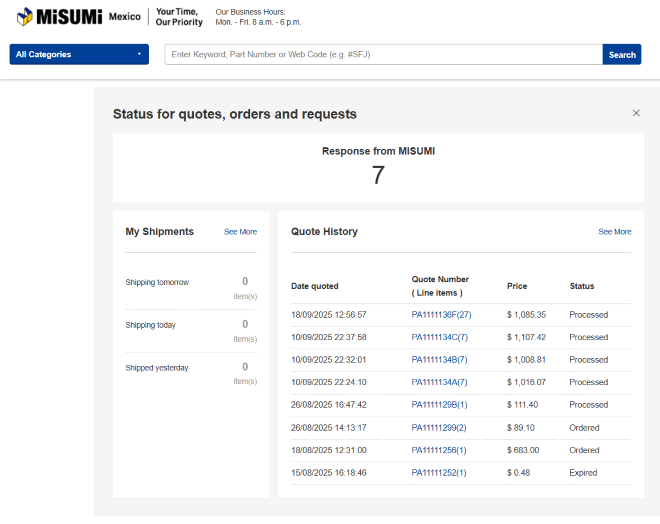 In case of the Orders required with quote to confirm the price, shipping date, and out of business hours request, MISUMI confirms them before processing. You will see the confirmation message when we complete quotation.