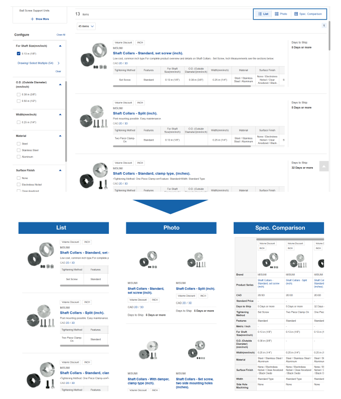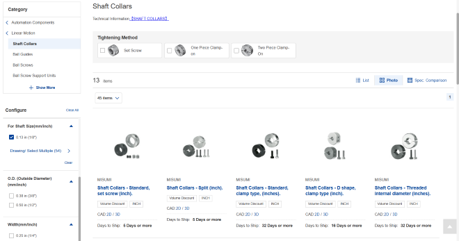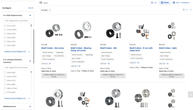 On the spec search page, you can narrow the number of products to focus on your needs by selecting the required specifications and/or dimensions of the needed part.