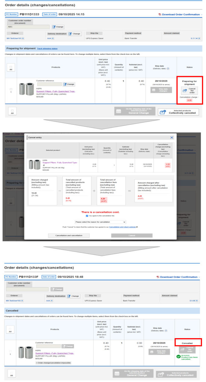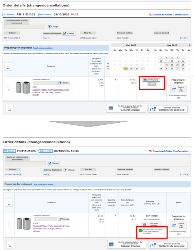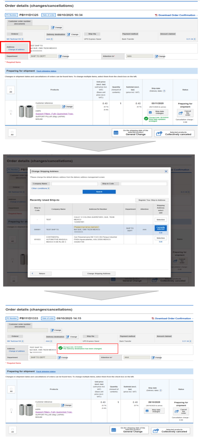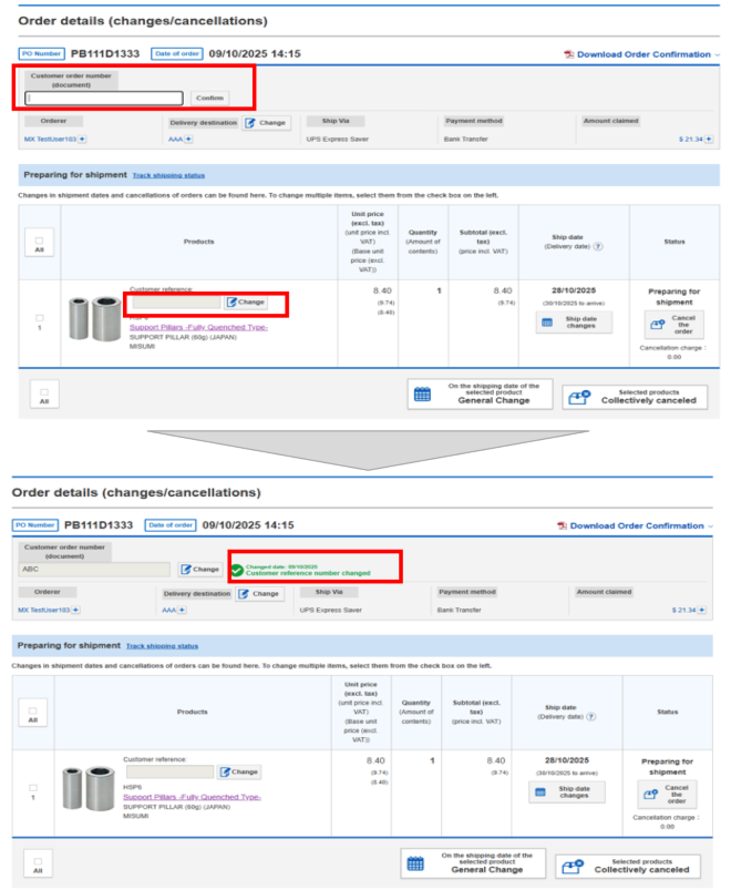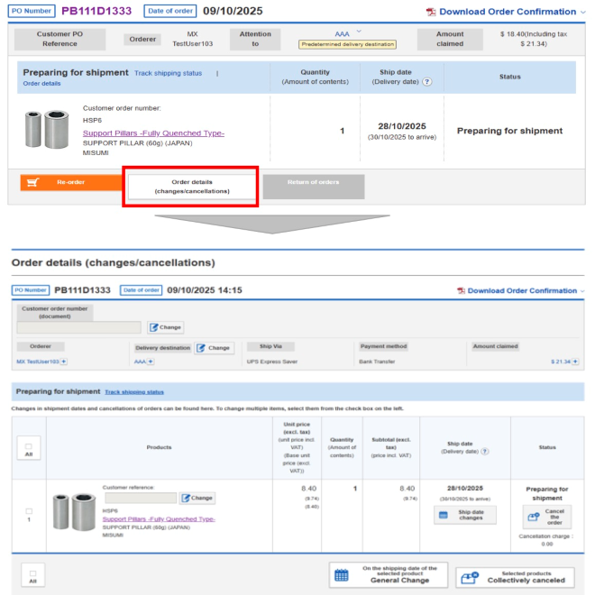 On the MISUMI website, you can modify your Shipping date changes, shipping address, and reference number.