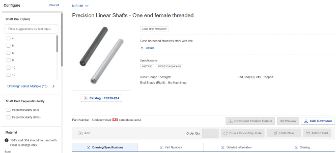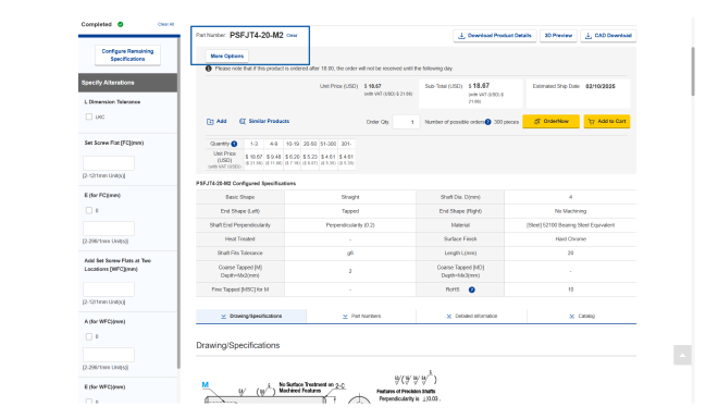 On the product page, you can view the detailed information of a product and select its specifications and dimensions.