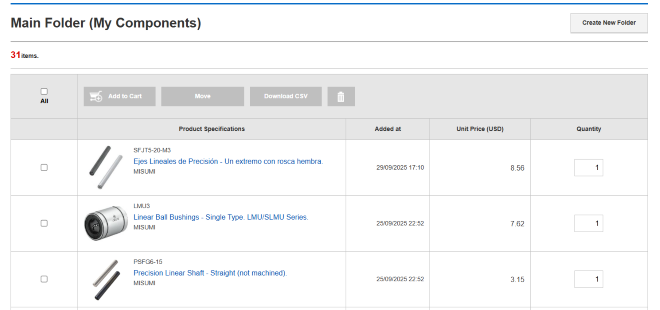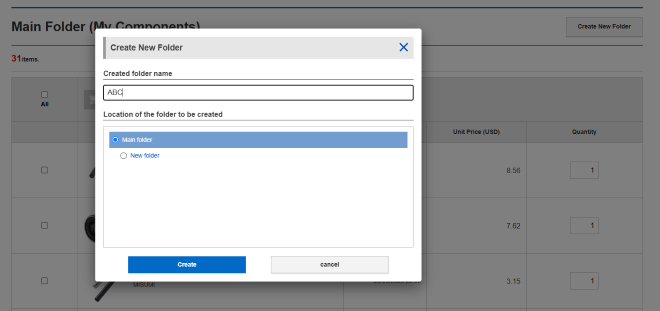 My Components allows you to save product information, such as part number, to folders and manage the saved information folder by folder.