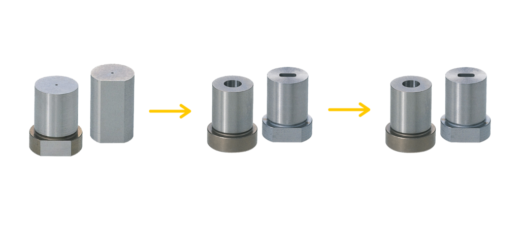 - Single hit dies: The material progresses across the die and each time it cycles it adds an additional feature to the die until get the final stage.
