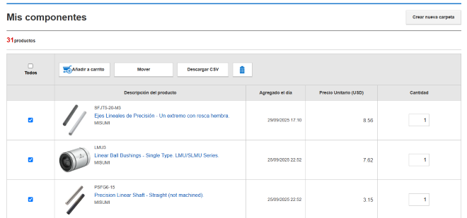 Puede descargar un archivo CSV que contiene Mis componentes.
