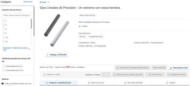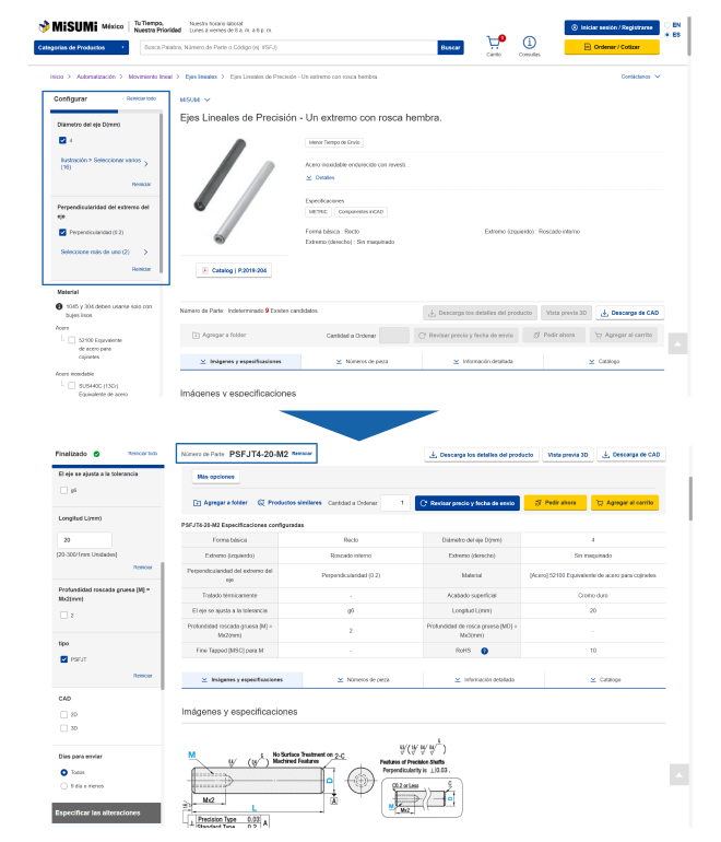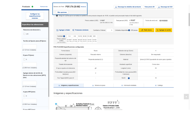 En la página del producto, puede ver la información detallada de un producto y seleccionar sus especificaciones y dimensiones.