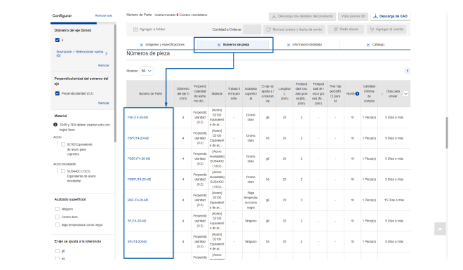 Seleccione especificaciones y dimensiones para reducir los números de modelo candidatos y seleccione el número de modelo deseado de la lista de números de modelo.