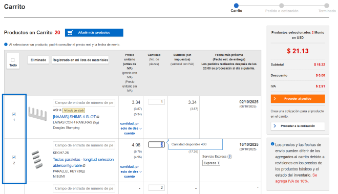 Seleccione un producto para ver su precio y la fecha de envío más reciente.