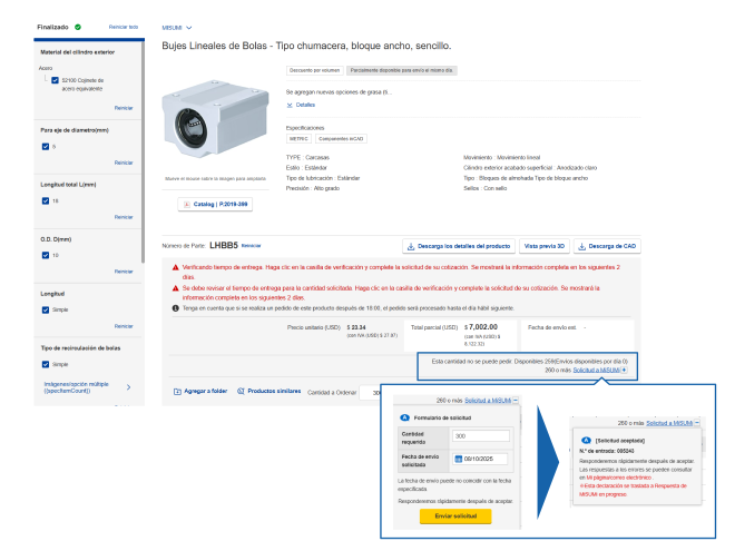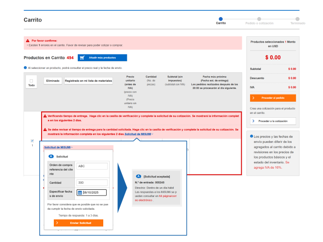Si no puede determinar la fecha de envío de los pedidos que superan los límites de inventario o de pedido, o si no puede encontrar el código de producto correspondiente, puede realizar una solicitud a MISUMI para que lo confirme.