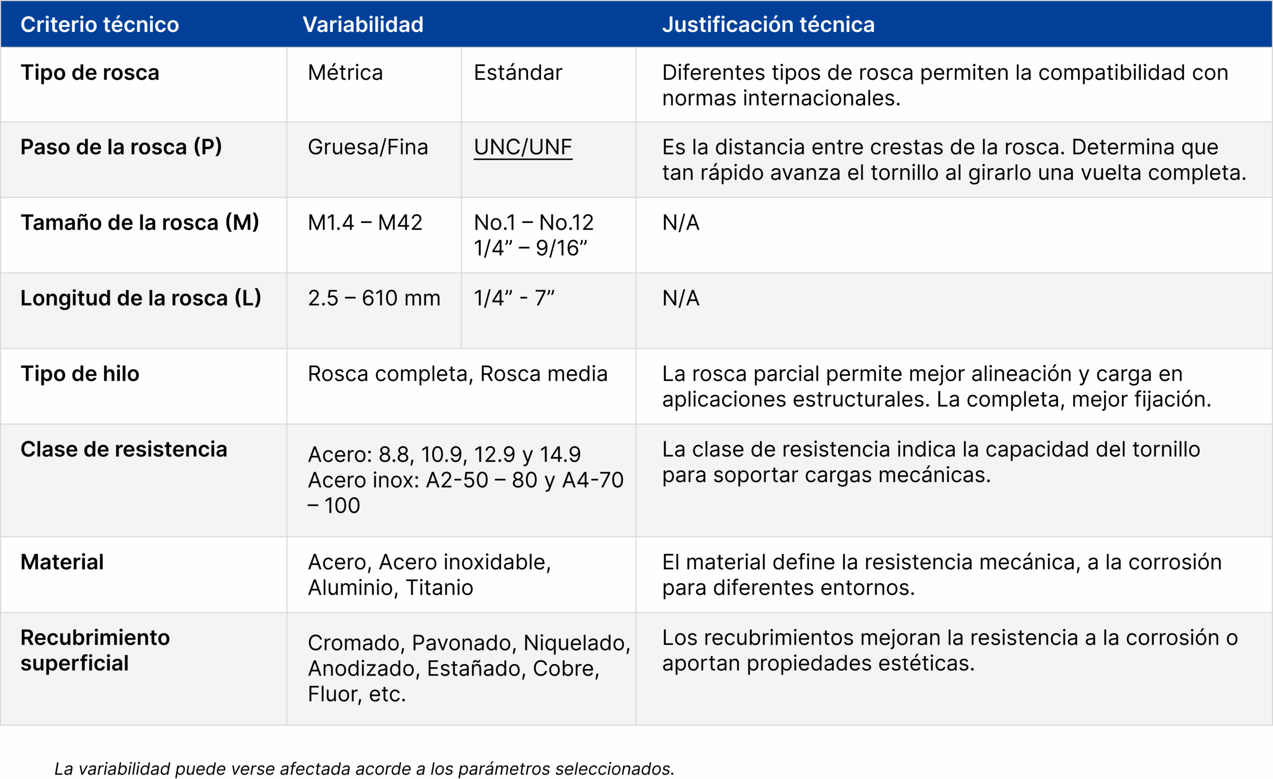 Definir el tipo de rosca, tamaño, longitud y paso. Un dimensionamiento correcto asegura una unión segura, evita sobrecargas y permite el montaje eficiente con las herramientas adecuadas.