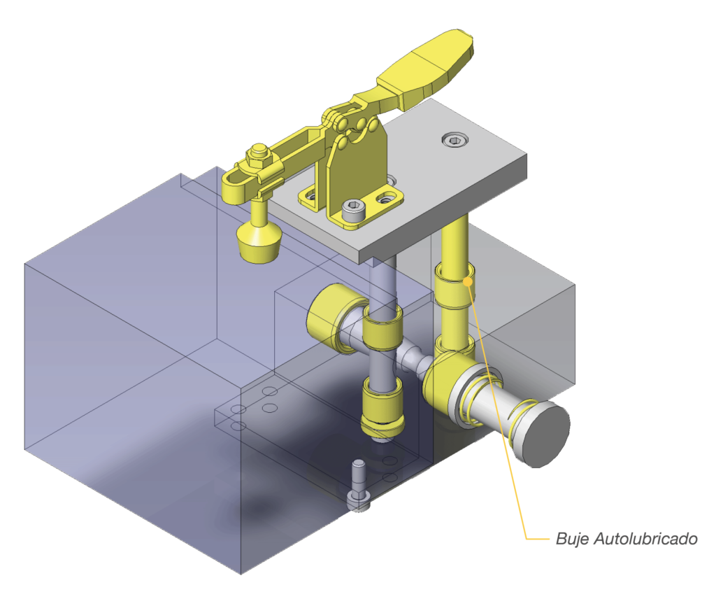 En esta aplicación se tiene un mecanismo para sujetar una pieza por medio de un clamp, donde los bujes gracias a su función permiten un movimiento lineal deslizante.