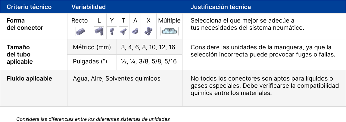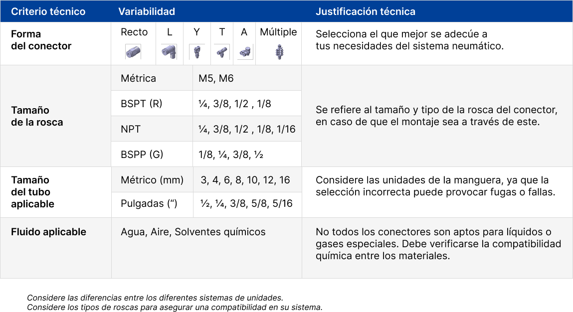 Selecciona de acuerdo con la función y configuración del sistema. Es esencial determinar si se necesita un conector: Roscado, de unión, etc, además de conocer su respectiva forma: Recta, L, Y, T, A, etc.