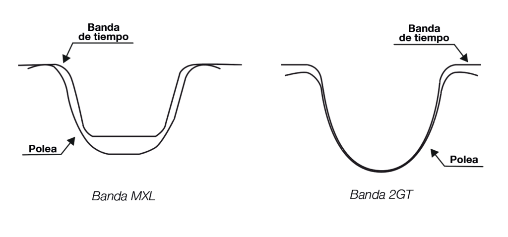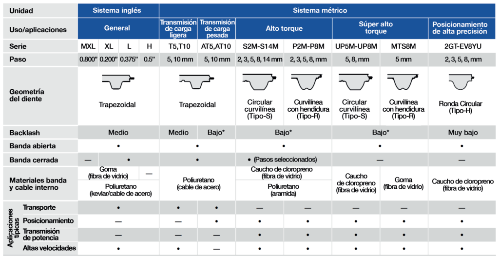 Backlash: Holgura que tiene cada banda en relación con su polea, entre menor sea el Backlash, se asegura un movimiento más preciso en el sistema. Se recomienda una banda con bajo backlash para aplicaciones de posicionamiento y precisión.